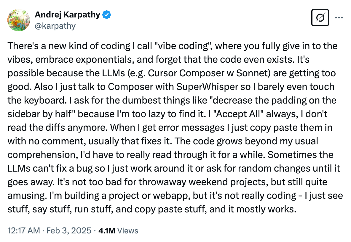 Jesus take the wheel mode (true vibe coding) popularized by tools like Lovable, Replit, and Figma Make